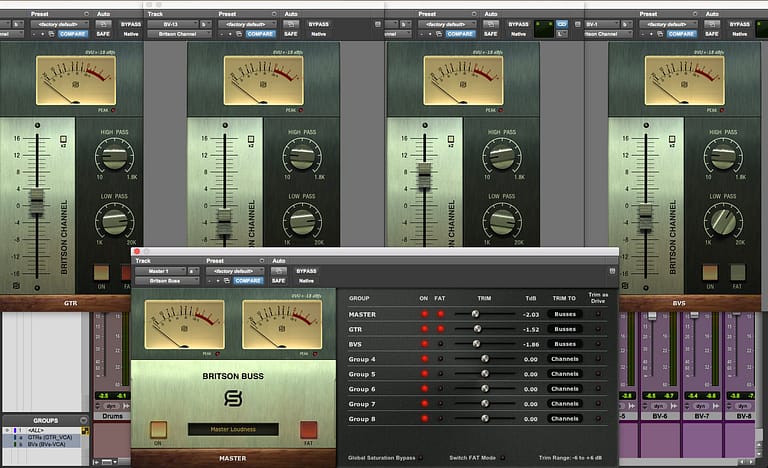 For starters I added a Britson channel on every track and created three group busses: Guitars, BGVs, and Master. Then I routed the track accordingly and assigned every instance of Britson channel to one of these groups.