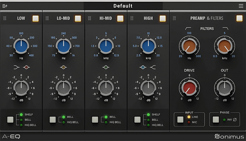 Traditional analogue EQs don’t just shape frequency — they often impart sonic colour at higher gains. Sonimus offers a range of EQs that blend precise control with musical saturation: