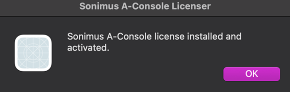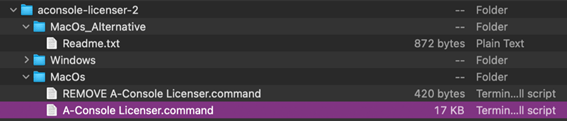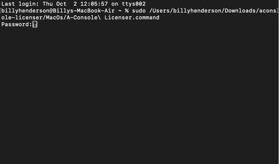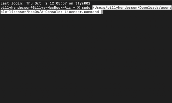 - Drag and drop the SonimusProductName Licenser.command (A-Console Licenser.command) file into the Terminal window.